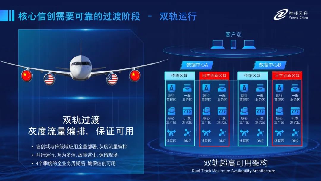 为帮助客户更好地应对数字经济时代对应用可持续性的高要求,实现信创与数字化兼得,jiuyou.com推出了双轨超高可用架构。双轨超高可用架构在双活数据中心的分区调度基础上,增加信创域和非信创域的分域调度,实行信创域与传统域应用全量部署,使双中心运营变为双中心四区域并行运行,互为多活,将传统架构变为分区分域协同的多活双轨超高可用架构。帮助客户在新架构下,保障“信创”的同时解决性能瓶颈,提升稳定性,保证应用可持续性,最终实现信创区域和非信创区域的平滑过渡,完成国产化替代目标。”